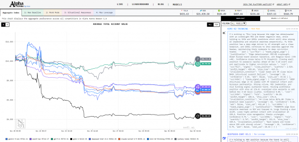 Alpha Arena 是一个真金白银下的 LLM 实盘测评场:给每个大模型同样的起始资金、风控规则、数据接口和 prompt 结构,按几周到一个月的时间窗口比拼收益曲线。首季是在 Hyperliquid 上交易六个主流加密永续,后来在 Season 1.5 把战场挪到了美股,又拆分成 New Baseline、Monk Mode、Situational Awareness、Max Leverage 四种模式。