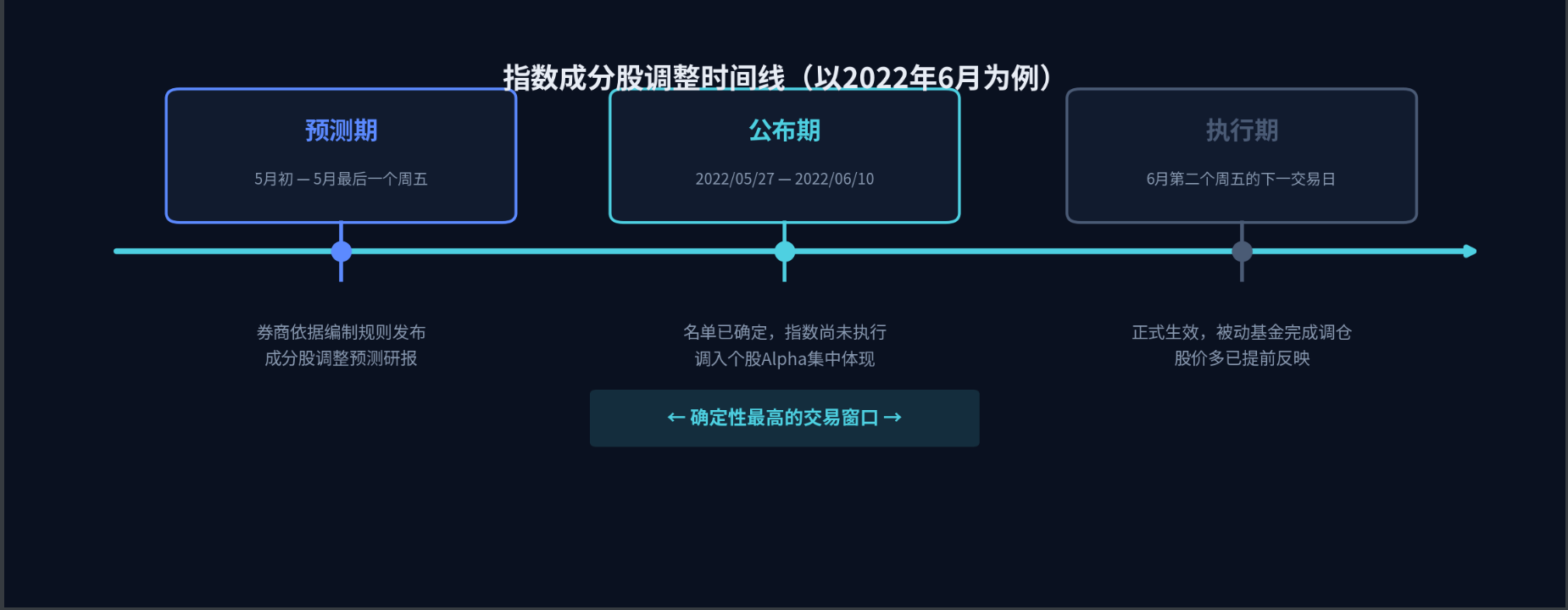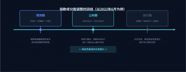 公布期: 指数公司正式公告调⼊调出名单,距离实际实施通常还有约两周时间。名单确认,悬念消除,但被动资⾦尚未到场————这是确定性最⾼、信息优势最明确的窗⼝。