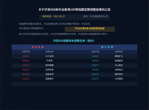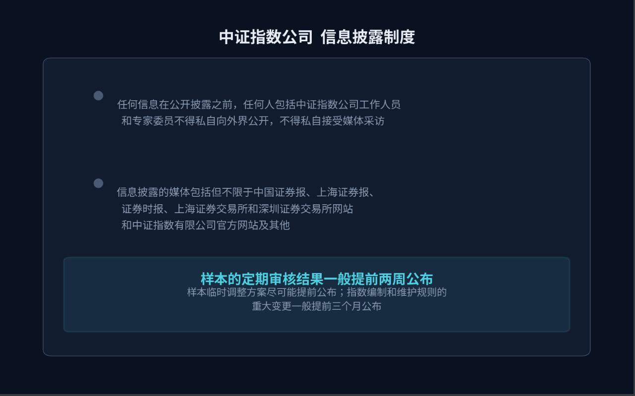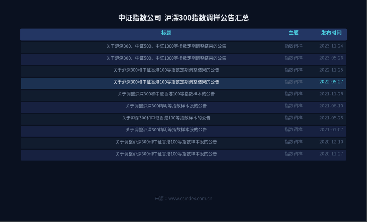 以中证指数公司编制的主要宽基指数为例(覆盖沪深300、中证500、中证1000等核⼼指数),成分股调整每年固定发⽣两次,分别在6⽉和12⽉。每轮调整包含三个关键时间节点: