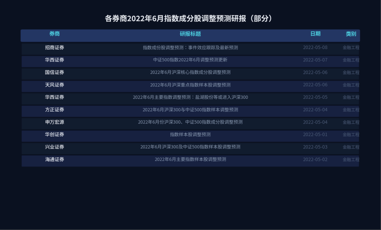预测期: 调整实施前约⼀个⽉,各券商研究所会依据指数编制规则,发布成分股调整的预测报告。此阶段信息尚有分歧,确定性不⾜。