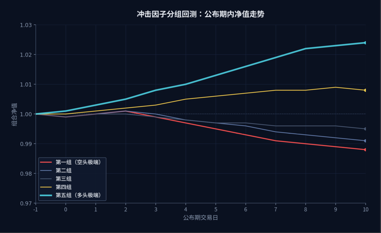 将每⼀期所有调整股票按冲击因⼦从⼩到⼤分成五组,统计公布期内各组的平均收益,分层效应极为清晰: