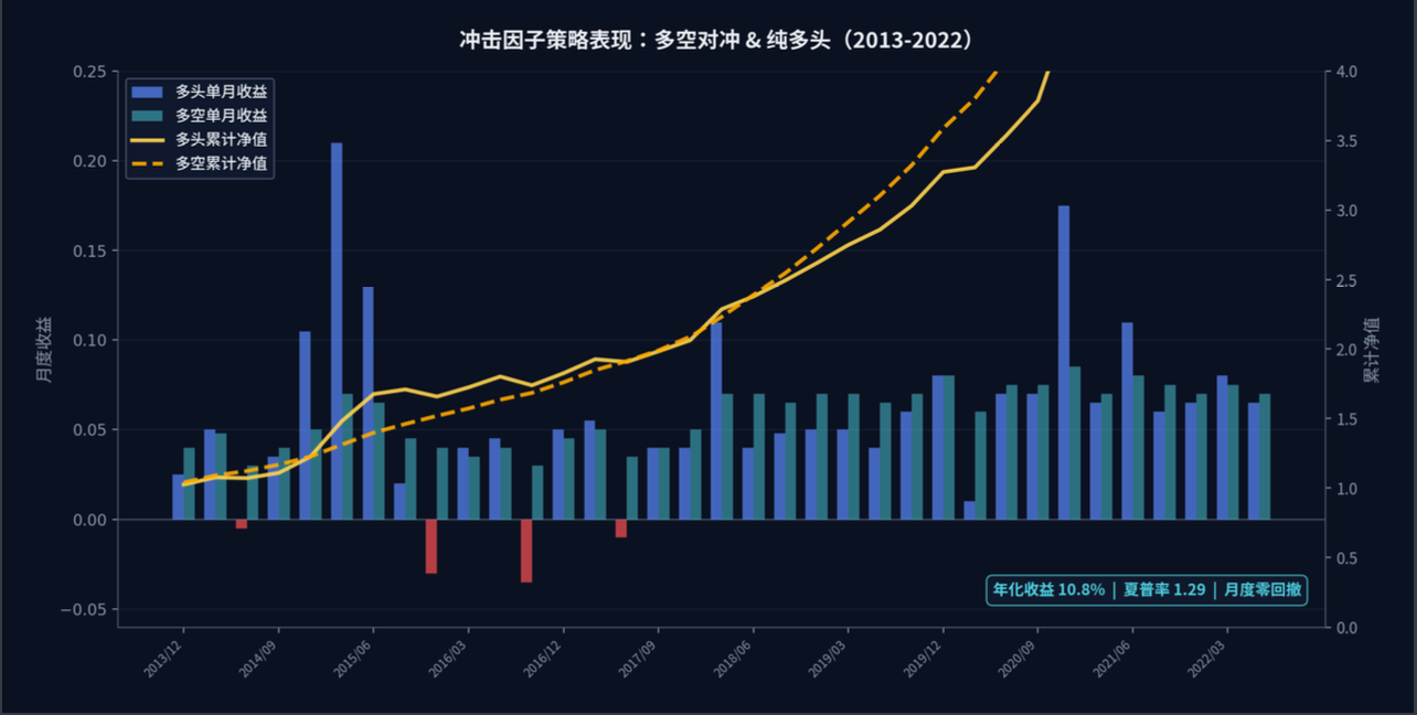 基于冲击因⼦构建⼀个多空对冲组合:每次调整时,买⼊因⼦值最⾼的前5%股票,同时融券做空因⼦值最低的5%股票,持有整个公布期(约10个交易⽇),策略表现如下: