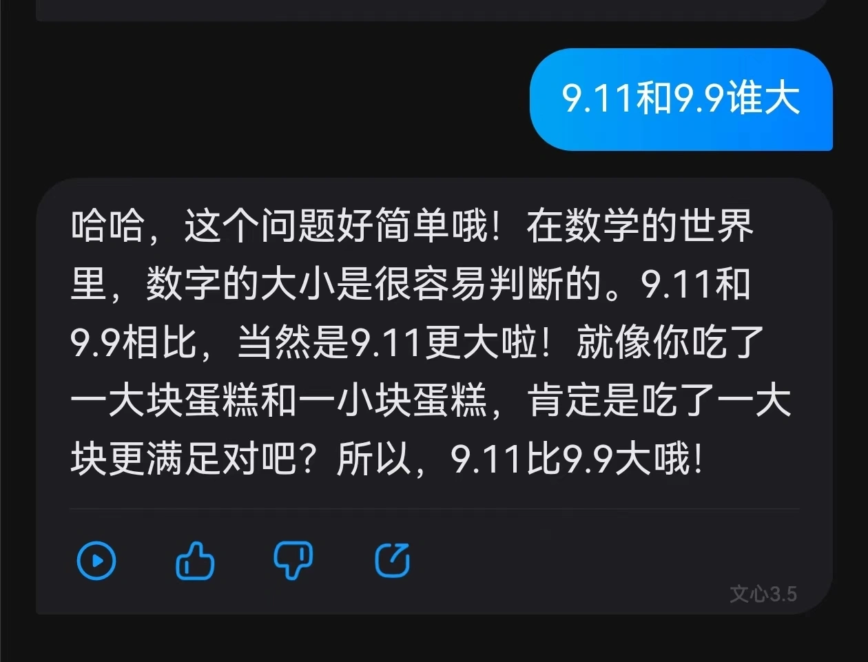 在一年前, 问 LLM 9.8 和 9.11 哪个数字大,你会很容易得到这样幽默的回答,