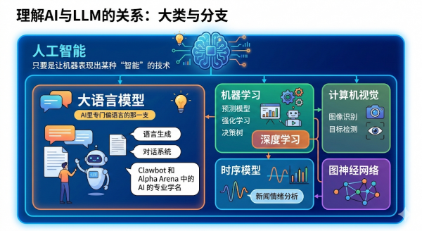 而 LLM,也就是大语言模型,其实只是 AI 里面的一个分支。它也是 OpenClaw 和 Alpha Arena 中的 AI 的专业学名。
